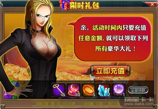 活动时间:2014年7月15日10:00 —7月17日24:00活动范围:所有服务器(活动期间新开服务器享受此活动)活动规则:活动期间,玩家充值任意金额,即可在活动页面领取额外奖励;奖励内容:仓库钥匙*5、5霸王色霸气*10、洗炼玉石*5、500装饰水晶*2、100紫魂*1