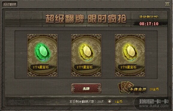【活动时间】:8月19日0:00——8月20日0:00【活动内容】:1. 活动期间,130级以上玩家都可参与超级翻牌活动。2. 界面中会出现各种等级的宝石,点击洗牌三张牌翻到背面互相切换位置后,可免费选择翻开一张卡片。3. 玩家可以通过消费金币翻开全部的卡片4. 每个角色每天可进行20次免费翻牌,可通过金币购买翻牌次数,每次购买递增1金币。