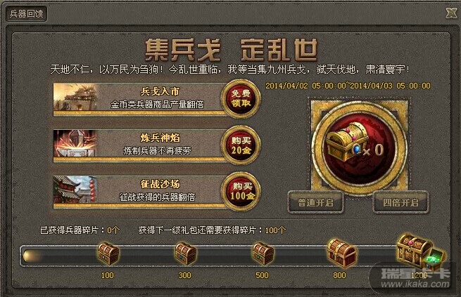 b)兵器产量达到一定数量,可领取对应宝箱,宝箱可选择普通开启或四倍开启
