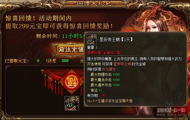 :活动期间充值达到指定元宝数,即可领取一份对应充值礼包,