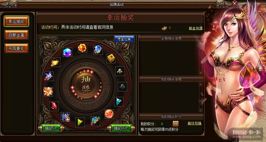 回馈玩家,感恩抽奖,《烈火战神》回馈活动幸运抽奖珍宝降临,红玉护体戒指、蓝灵复活戒指、黄金麻痹戒指、幸运骰子、黄金屠龙勋章等超级装备静待领取,快来测测手气吧!活动时间:9月10日0:00 - 9月12日23:59活动详情:活动期间,玩家可在幸运抽奖界面花费一定元宝进行抽奖,每抽奖一次可获得20积分,累积积分也可直接兑换稀有物品。