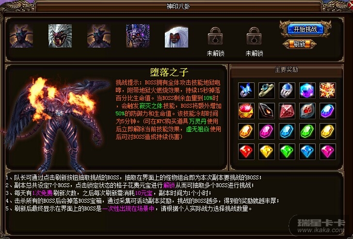 (2)队长可通过点击刷新按钮抽取挑战的BOSS,抽取在界面上的怪物组合即为本次副本要挑战的BOSS。