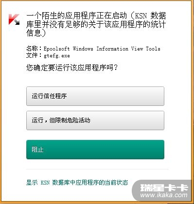 这就是卡巴的聪明处,提高了安全性,降低了弹窗数量!你想啊,没有签名并且在云中也没有安全信息,那换做是瑞星,瑞星会弹窗拦截吗?会出一个拦截窗口就结束了吗?肯定不会是吧?肯定很多个弹窗是吧?你看卡巴(如上图),若用户是主动运行的并且知道来源,换句话说程序是安全的,那他就可以点击信任!若不确定就点击限制,那这个程序几乎做不了恶!这样考虑即安全,弹窗又少,何乐又不为呢?