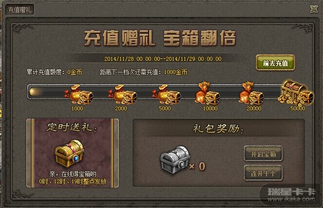 1)累计充值达到一定的额度,就可以领取对应的充值礼包2)充值礼包可获得金币,宝石,点券等丰厚奖励3)充值50000金币即可额外获得大满贯奖励4)大满贯奖励:1000金币20000宝石200000点券5)定时送礼:0时,12时,19时,在线玩家可获得在线礼包