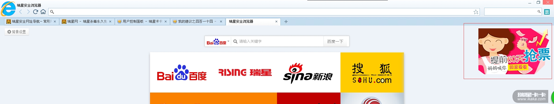 打开新的标签页,看到标有“提前60天抢票,妈妈喊你回家看看”的广告,建议把它取消或已其它方式进行显示。(如图所示)