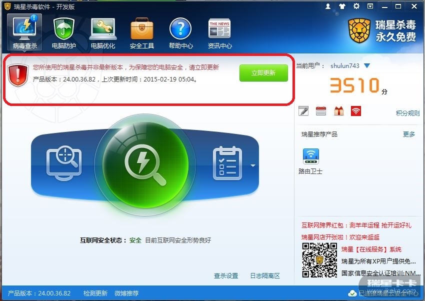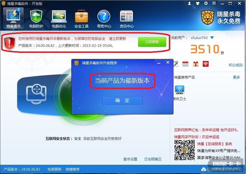 结果:升级到最新版了,单瑞星主程序提示 不是最新版 ,好几天没有升级了
