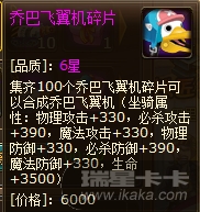 坐骑属性:物理攻击+330,必杀攻击+390,魔法攻击+330,物理防御+330,必杀防御+390,魔法防御+330,生命+3500