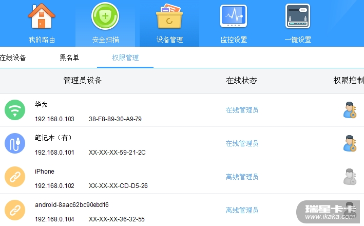 在瑞星路由安全卫士中,设备管理员的设置是先来后到的原则(路由器要求有管理员功能),管理员列表是从路由器管理页面上取得的,数据与管理页面相同。路由器会记住每个曾经登录的用户,这样就分配好了IP ,下次再登录时不用重新分配,而离线的管理员会显示成灰色。