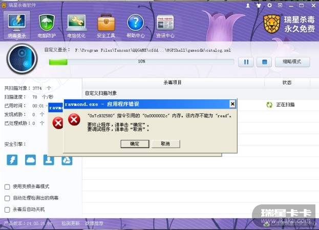 另外瑞星杀毒在我这台本本上面 会出现错误 然后瑞星就停止扫描 不动了,扫描时间也停了。