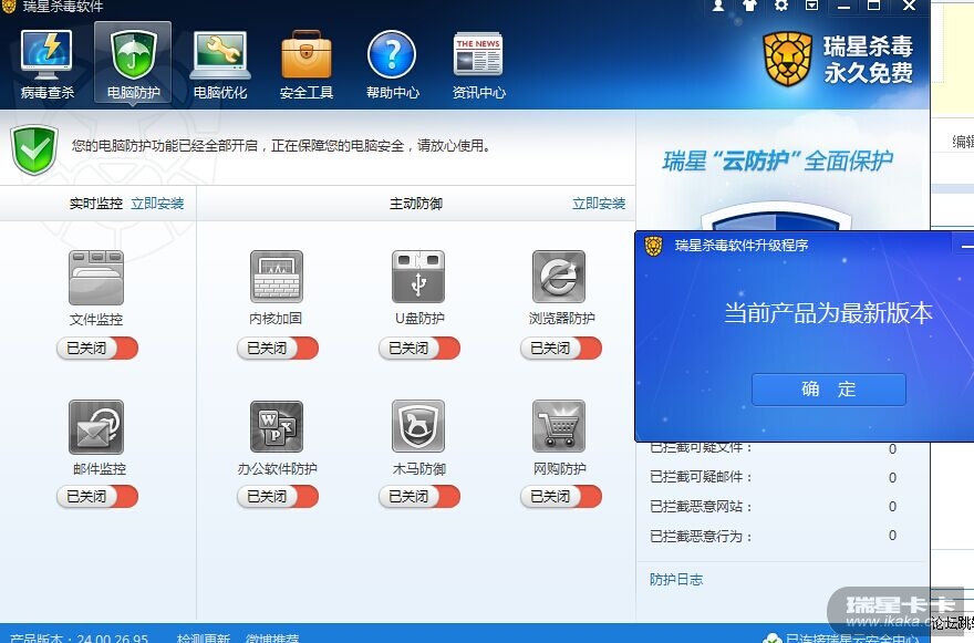 之前更新不了的情况,我昨天下午把瑞星修复了一下,然后可以正常升级更新了,可是监控和防护又关闭了,手动安装后,开机又复现监管和防护丢失的情况了呀