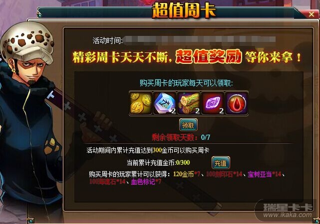 活动时间:2015年5月12日10时——5月14日24时活动范围:5月5日之前服的服务器(包括5月5开启的服务器)活动规则:1. 活动期间,玩家活动期间内累计充值300金币可通过活动页面XXX周卡,每次活动最多XXX一次;2. 活动期间,XXX周卡后,可以获得7次领取机会,每天最多领取一次。3. 奖励未领取完毕的不能XXX下次周卡活动界面: