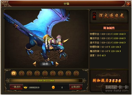 坐骑的升级:坐骑等级可通过使用坐骑进化丹和直接使用元宝升级提升,每次使用坐骑进阶丹可为坐骑增加