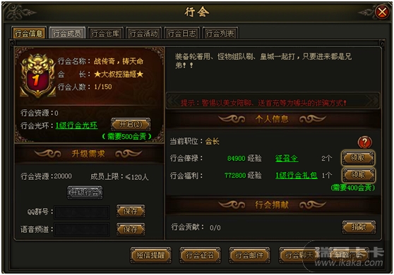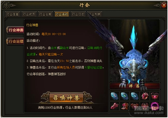 ,由会长和副会长可进行召唤,召唤击杀后,所有在场人员可获得大量经验奖励,行会等级越高,神兽掉落也越好