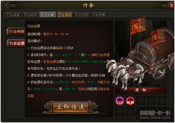 由xxx以上职位我那家消耗行会资源发布运镖,发布运镖后标着自动召唤并跟随发布者行驶,镖车可被攻击,在安全区内也会被攻击,镖车附近每