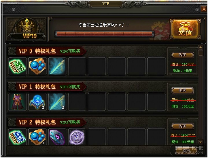 3.VIP达到一定等级后,可以XXXVIP特权礼包,不同VIP礼包价格不同二、级别划分1.VIP级别,根据累计充提取元宝值的不同,划分为V0到V10,11个等级2.VIP0没有任何特权。3.从V1开始,各等级对应的累计提取元宝金额分别为:VIP等级