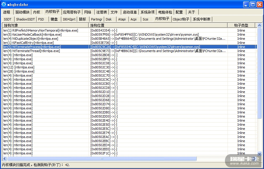 再就是请挂钩 线程钩子 ,请添加 apc之类的钩子,防御瑞星被异步调用 干掉进程!!!