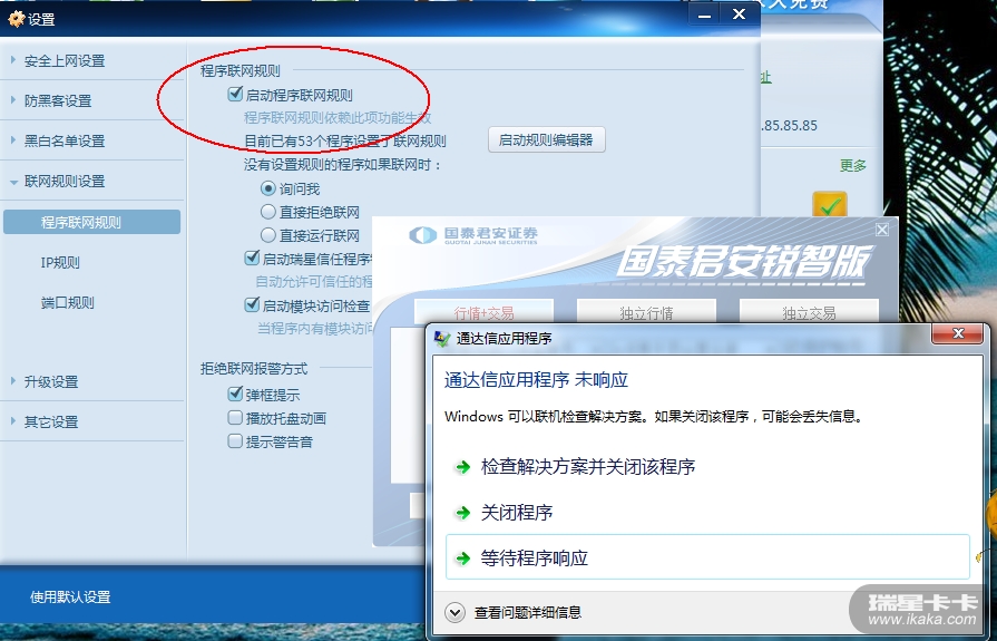 瑞星防火墙导致国泰君安股票交易软件无法正常登录!