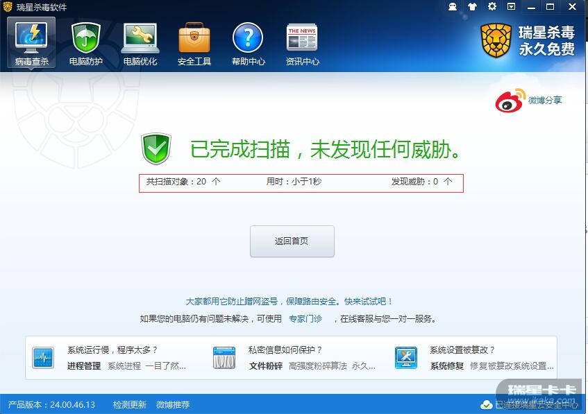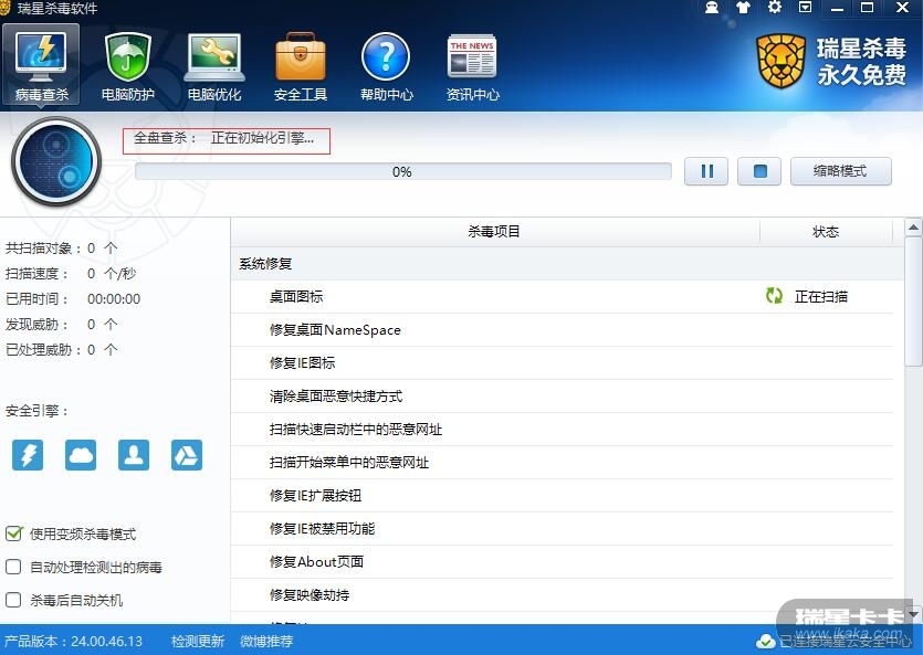 我全盘时, 引擎不是初始化卡主 ,然后就是 扫描20来个文件就报告完成!!!
