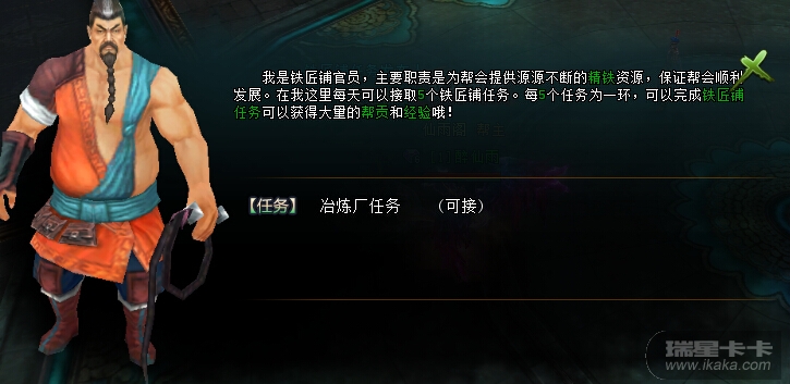 帮会任务:帮会任务分为,农场任务,伐木场任务,铁匠铺任务,矿洞任务四种。常规任务是帮会粮食、木材、精铁、石料资源的重要来源,同时也是玩家赚取帮贡的重要途径。帮会所有成员均可在帮会城市的各个资源场管理员处领取常规任务。玩家在同一资源场每天只能领取5个常规任务,共计20个。完成次数越高,获得奖励越丰厚。