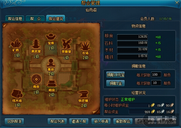 建筑升级:帮派建筑升级需要一定的时间,当时间满足以后还需要达到要求的资源,帮派资源可以通过时间增长和完成帮派任务获得