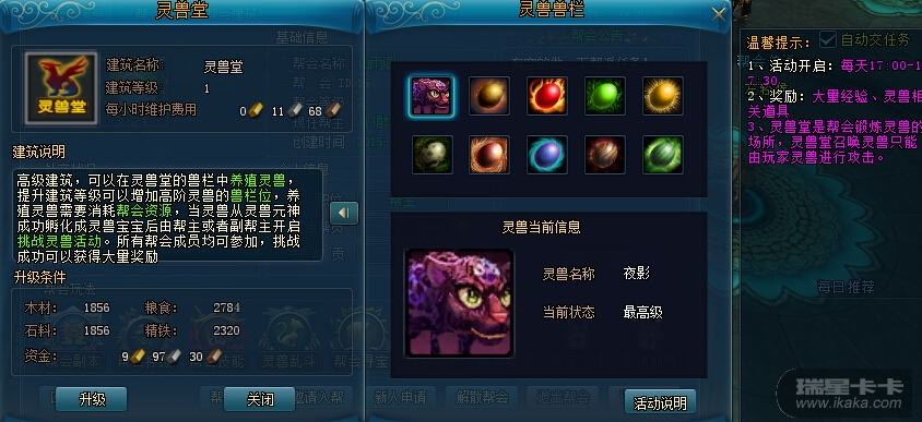 灵兽堂活动:每天15:00-15:30自动开启。帮会成员都可以参加