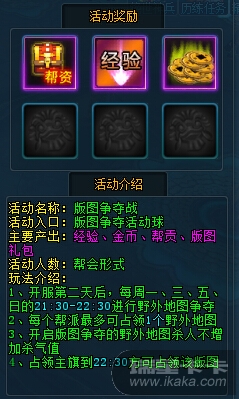 所有报名帮会在版图争夺战开启之后在可争夺场景内PK不增加杀气值,死亡不掉了装备耐久值,帮会占领的地图数量无限制。