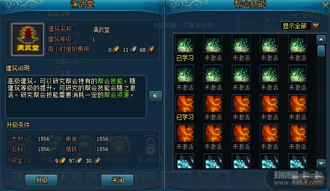 研究技能:帮派技能升级同建筑升级,也需要固定的时间和资源。帮会技能研究成功后,玩家可以在演武堂使用帮贡学习帮会特有的帮会技能。