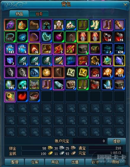 道具栏:摆放所有基础道具,装备,药品的包裹栏位,由于背包空间建议将一些不常用的道具存放至仓库内,可以节省背包空间。包裹栏位可以通过花费元宝扩大。