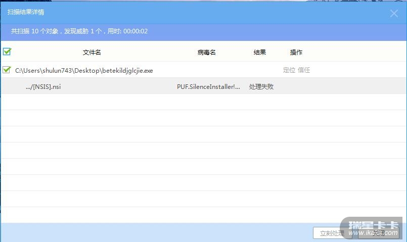 病毒运行后 ,瑞星检测到 样本后,提示处理失败