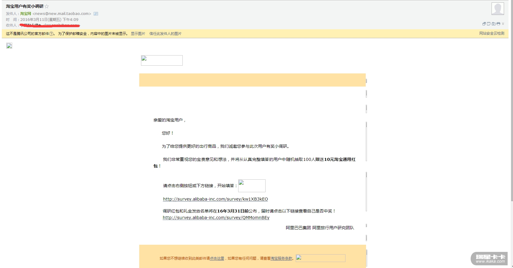 [求助] QQ邮箱收到“淘宝用户有奖小调研”的邮件,请各位帮忙鉴定是否是钓鱼邮件?