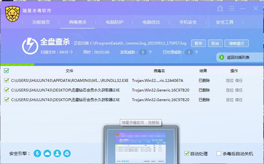 win7-32 ,瑞星无法处理 活动的 病毒进程,多次扫描 ,总是遇见