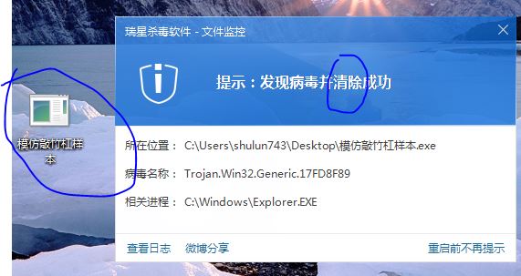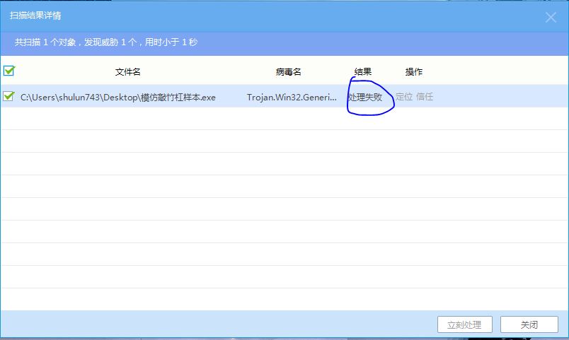 win7-32 ,运行病毒,但是瑞星提示杀毒成功,但是处理失败了