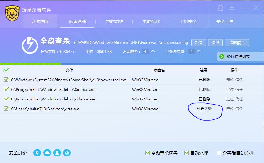 又是 系统加固和行为双哑火,处理失败,全盘感染,备份到隔离区失败