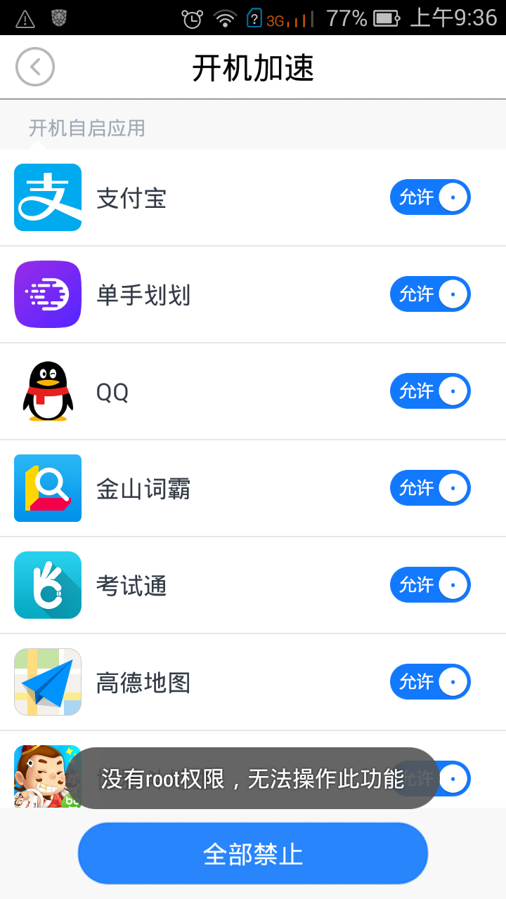 1、禁止启动项时依旧提示不能获取ROOT权限,请提供截图看看;