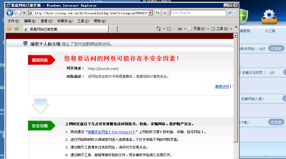 电脑装的瑞星杀毒V17,个人防火墙。上网防护都失效了,也加强防护了,还是失效。表示能拦截两三天,然后就没反应了,之前装了个2345安全卫士做优化软件用的,下午卸载了,两款瑞星也都重装了三次,还是没用,麻烦看看吧,浏览器用的是360安全浏览器,能拦截,这两三天不行了,IE也没用这是瑞星安全日报6.7的,正常打开了,用的IE截图的