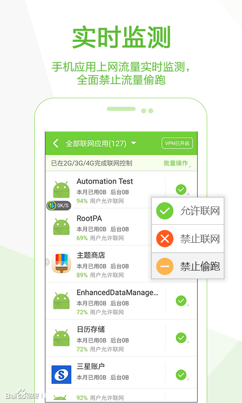 v 实时监测:应用联网实时监测,全面禁止流量偷跑