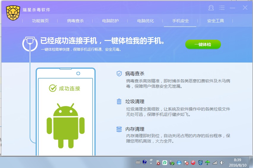 理由:插入手机时,瑞星V17显示的已插入,而PP助手则显示的是“没有找到华为驱动,安装失败。”的提示。