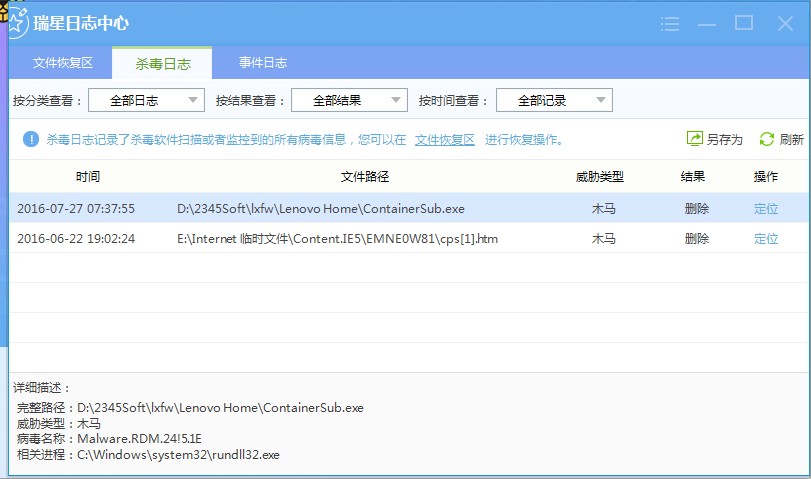不是让你点定位,是让你在隔离区里面把那个文件恢复出来,而不是在查杀日志里