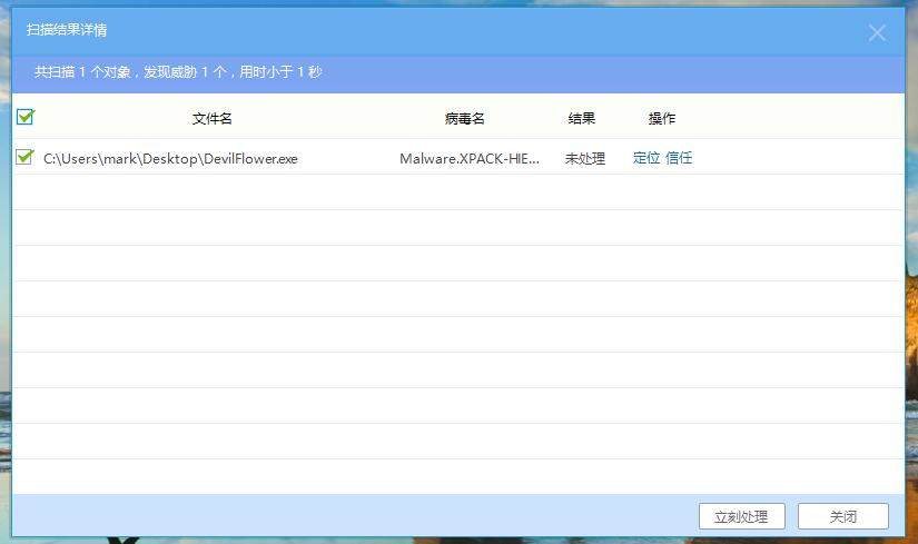 结果 :  接收方 ,收到这个 病毒exe后 ,文件监控不报警!!!没有任何提示 ,只有右键扫描时 才报警!!!