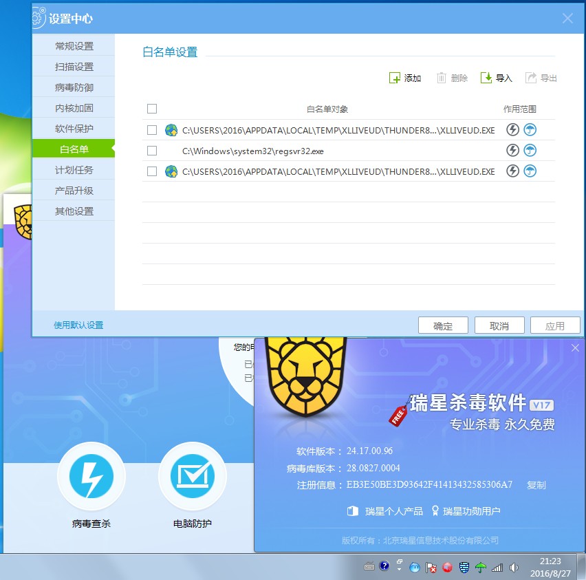 安装迅雷最新版本时,瑞星弹出一个红色的对话框。(由于当时没有截图,所以没有办法提供)