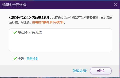 瑞星安全云终端的功能跟瑞星杀毒软件、瑞星个人防火墙有重合,所以会提示卸载