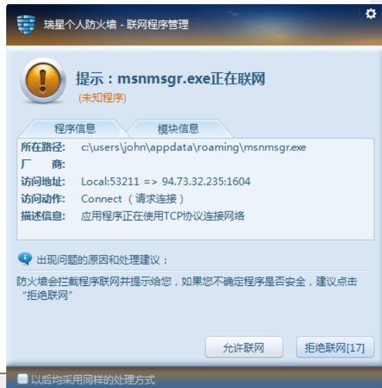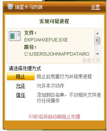 双方均有系统加固提示。选择阻止以后病毒进程未退出。但是应该阻碍了病毒进程的正常运行。