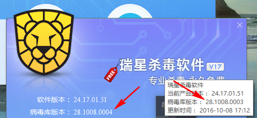 升级病毒库后,软件的关于界面中病毒库版本会改变,但是系统托盘图标处的病毒库版本不会改变。