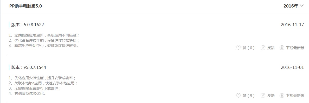 说明:PP助手目前是最新版本。安装完后从PP助手更新中就能检测出疑似问题。即:v5.0.7.1544版本升级到5.0.8.1622版本。