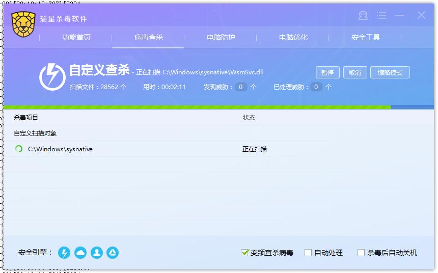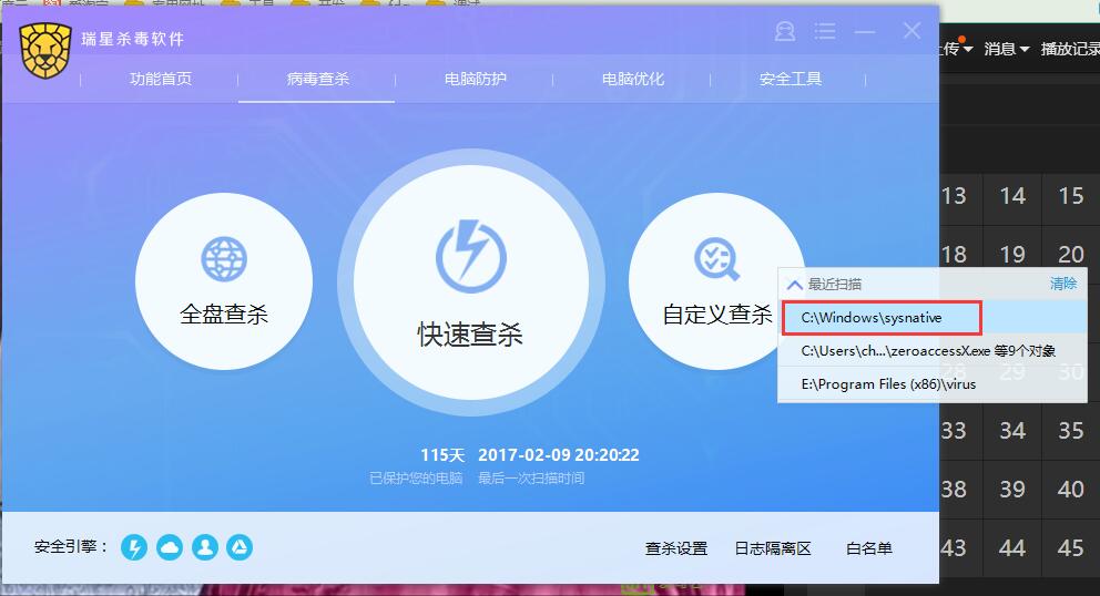 2、若是 在 主程序 的自定义 扫描中 创建 扫描 sysnative 文件夹的 记录后, 删除 Win下的 sysnative文件夹,然后你启动主程序 自定义扫描,发现瑞星路径识别错误!