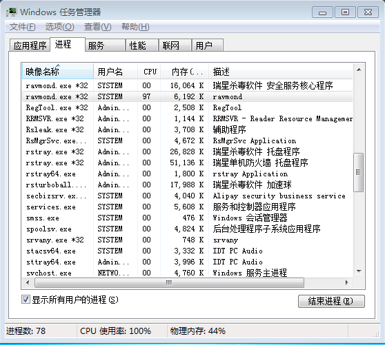 当时只是在上网,突然打不开网页了,一看任务管理器就这样了,这种现象很多次了。安全软件只用瑞星,很多年了,最近才经常出现ravmond占用cpu 99%,重启后正常,上网一会儿又出现。