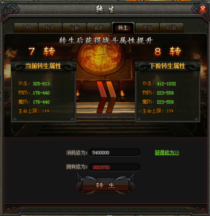 玩家通过转生可以为自己提升各项属性,转生是为了限定玩家穿更高等级的装备。