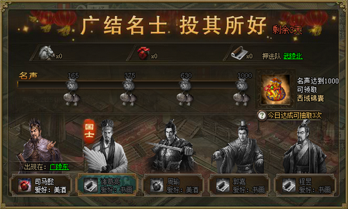 1. 结交名士(或国士)奖励:每次结交,可随机获得经验、粮食、镔铁、宝石、