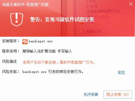 瑞星阻止搜狗输入法手写输入程序(handinput.exe)