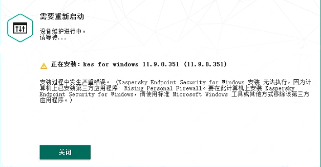 在用户电脑上安装卡巴斯基KES for Windows 11.9.0.351时,报存在不兼容软件Rising Personal Firewall